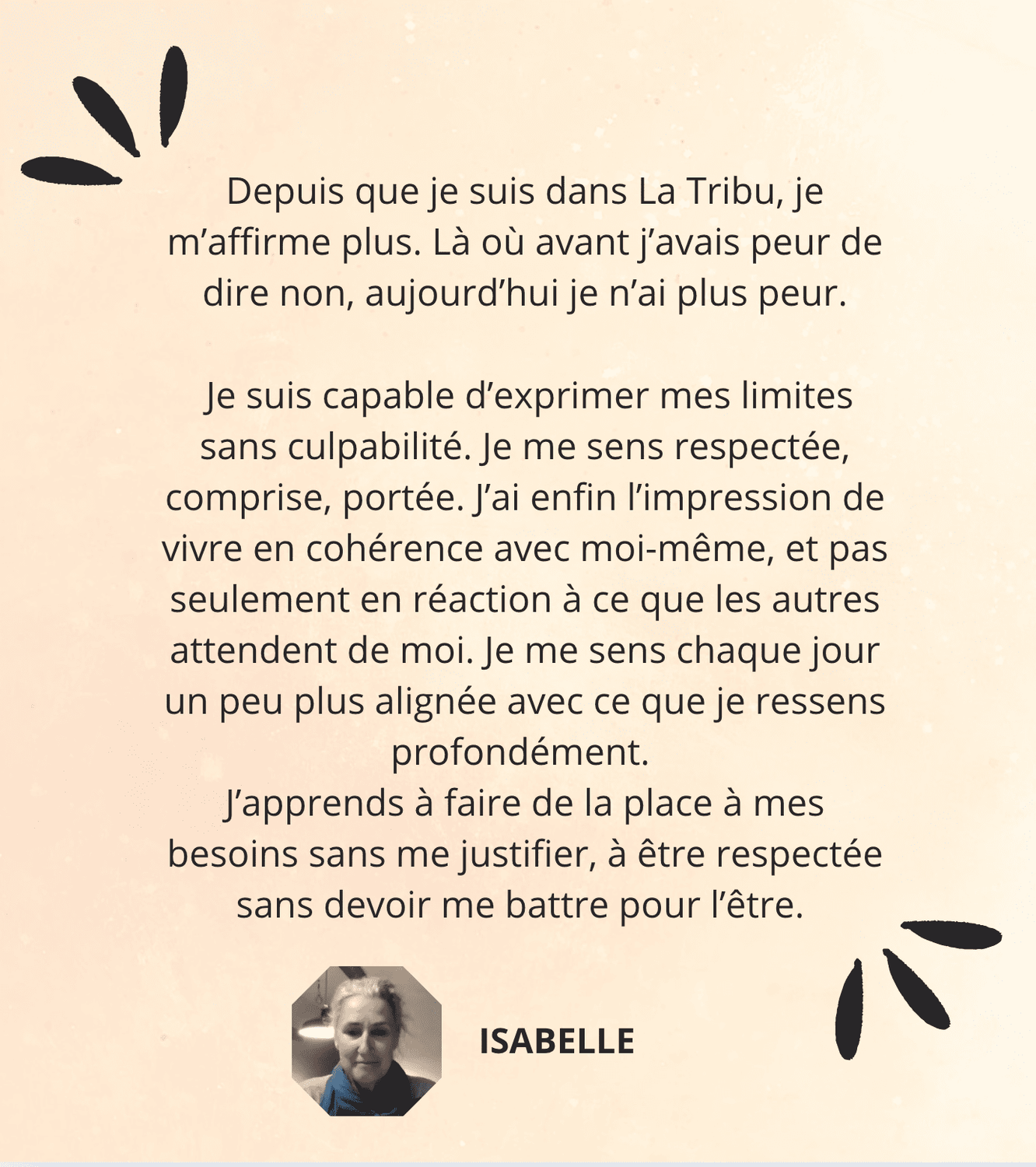 Retrouve confiance, pose tes limites, choisis-toi. Avec La Tribu. Sans t’excuser. Sans t’épuiser.